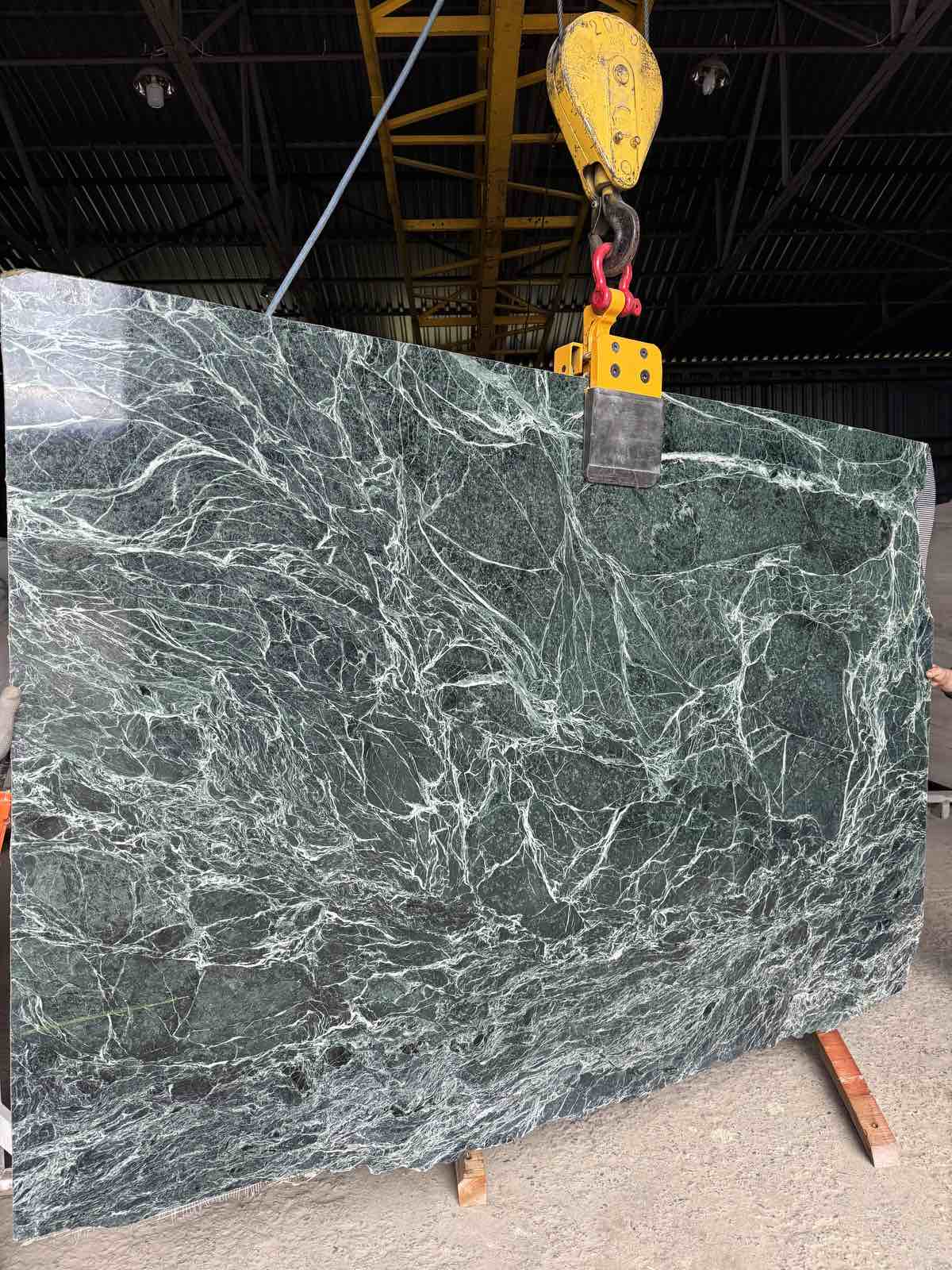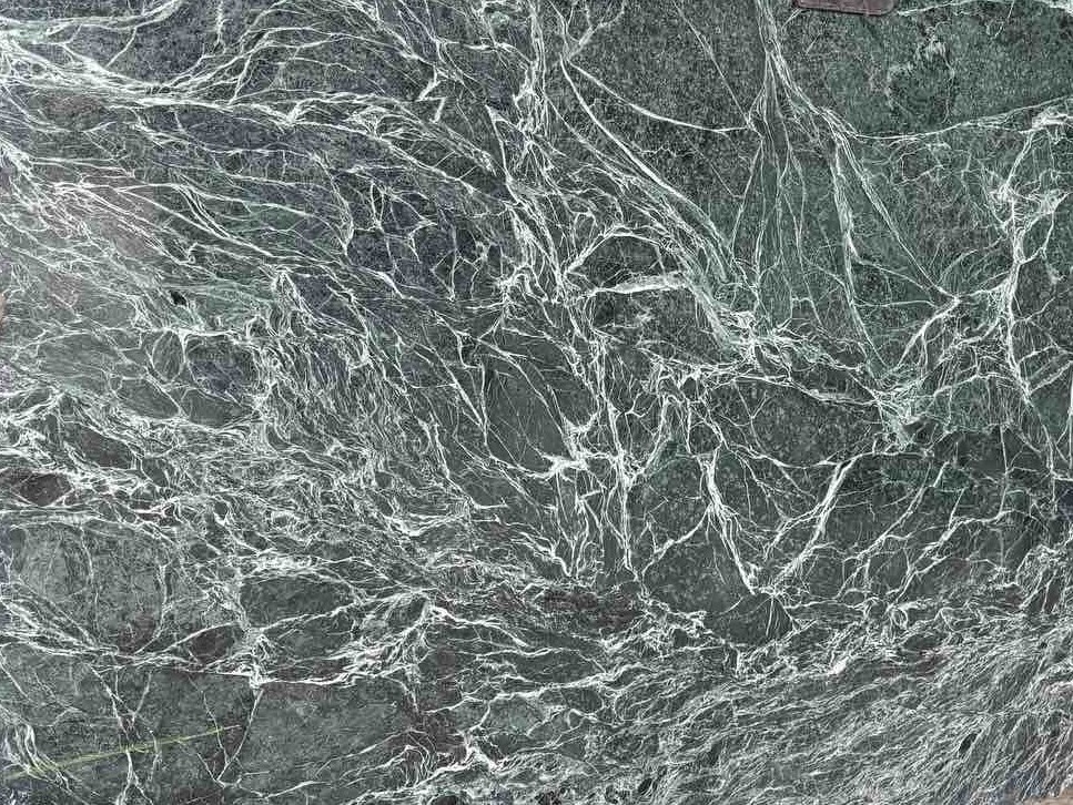 Мрамор Verde India — это прочный индийский мрамор глубокого изумрудно-зеленого оттенка с темными прожилками. Этот натуральный камень отличается высокой плотностью, износостойкостью и низкой пористостью, что делает его идеальным для облицовки стен, полов, каминов, изготовления столешниц и лестниц