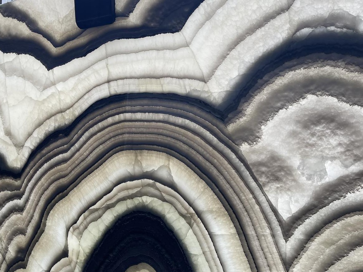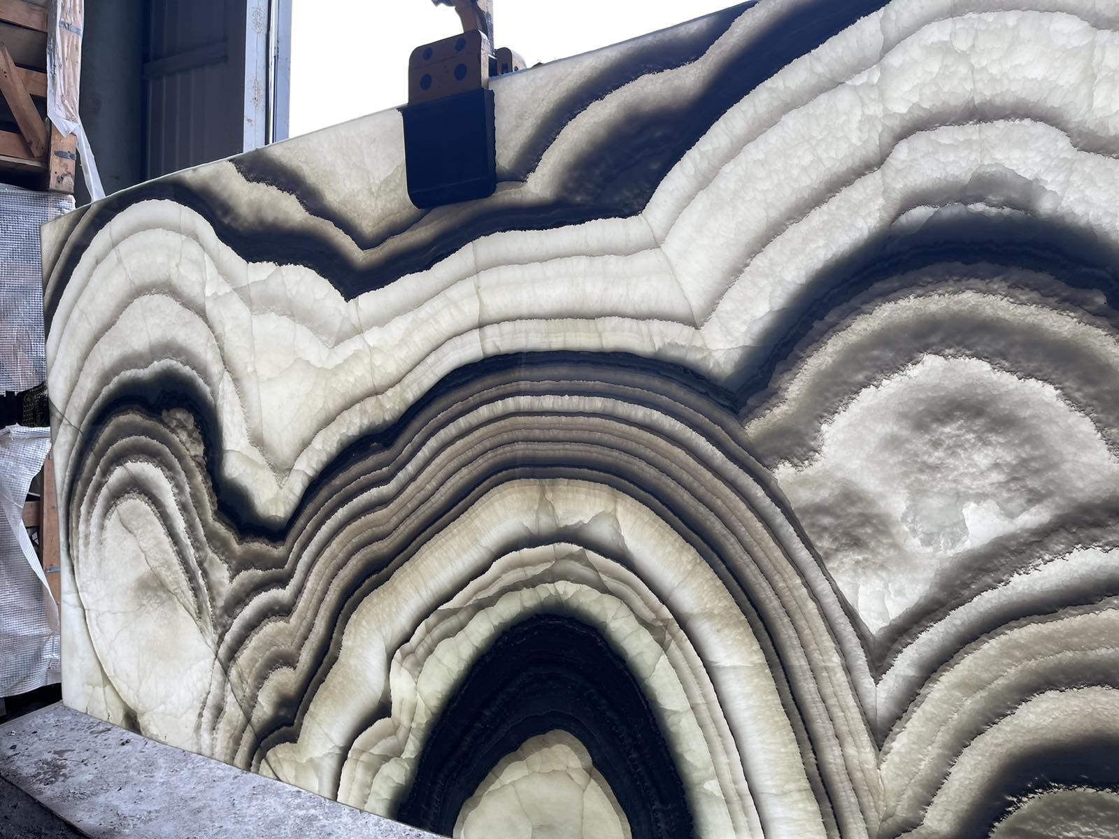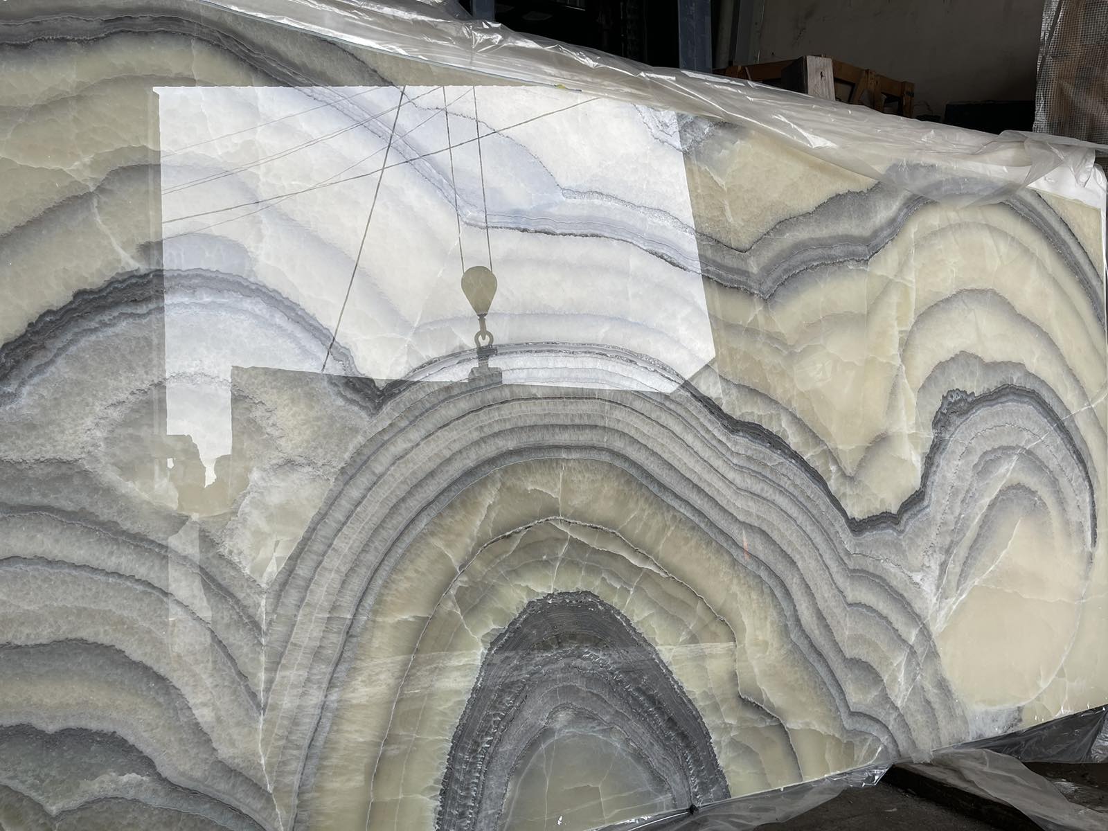 Как и многие ониксы, Pearl Grey обладает полупрозрачностью, что позволяет использовать его в проектах с внутренней подсветкой для создания «светящихся» стен или панелей.