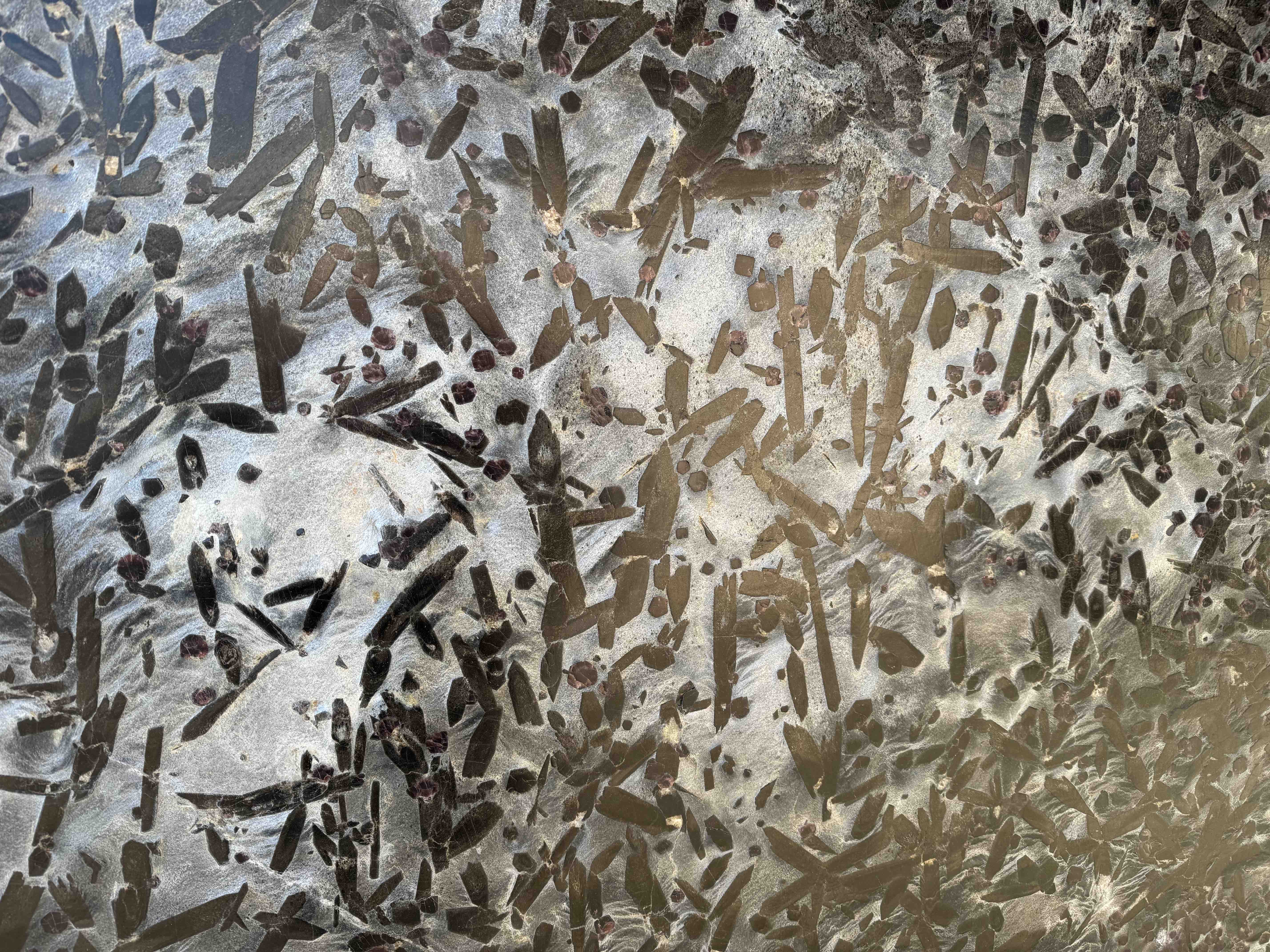Вкраплення та плями: По всій поверхні розподілені ділянки білого, сріблястого та іноді блідо-блакитного кольору.
